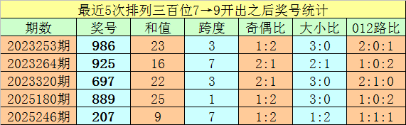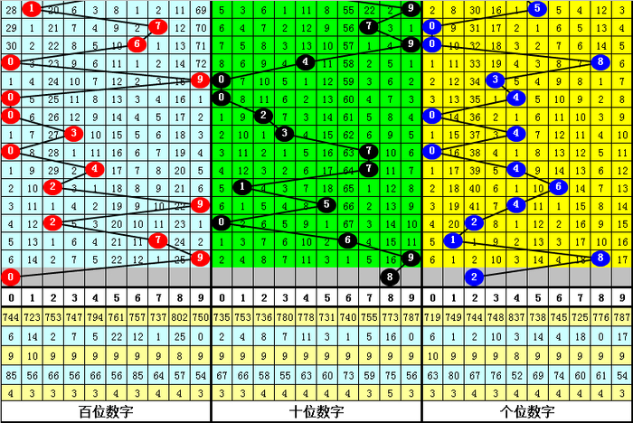 1、排列三最近两期百位号码分别开出7和9,历史上百位号码连续两期分别开出7和9的奖号出现了75期。前五期开出之后其下期奖号分别为:986、925、697、889、207;