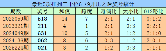 1、最近两期排列三十位号码开出号码分别为6和9,历史上十位号码连续两期同时出现号码6和9的奖号共开出71期。最近五次下期开出号码为:518、211、631、062、021;